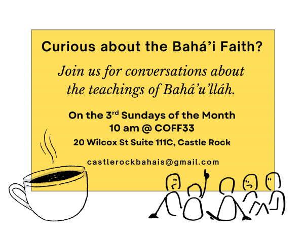 10 am at COFF33 Location Castle Rock, CO 3rd_sundays_curious_about_the_bahai_faith.png Castle RockUpcoming dates: Sun, 11/16/2025 - 10:00am...and 98 more. add this event to your calendar